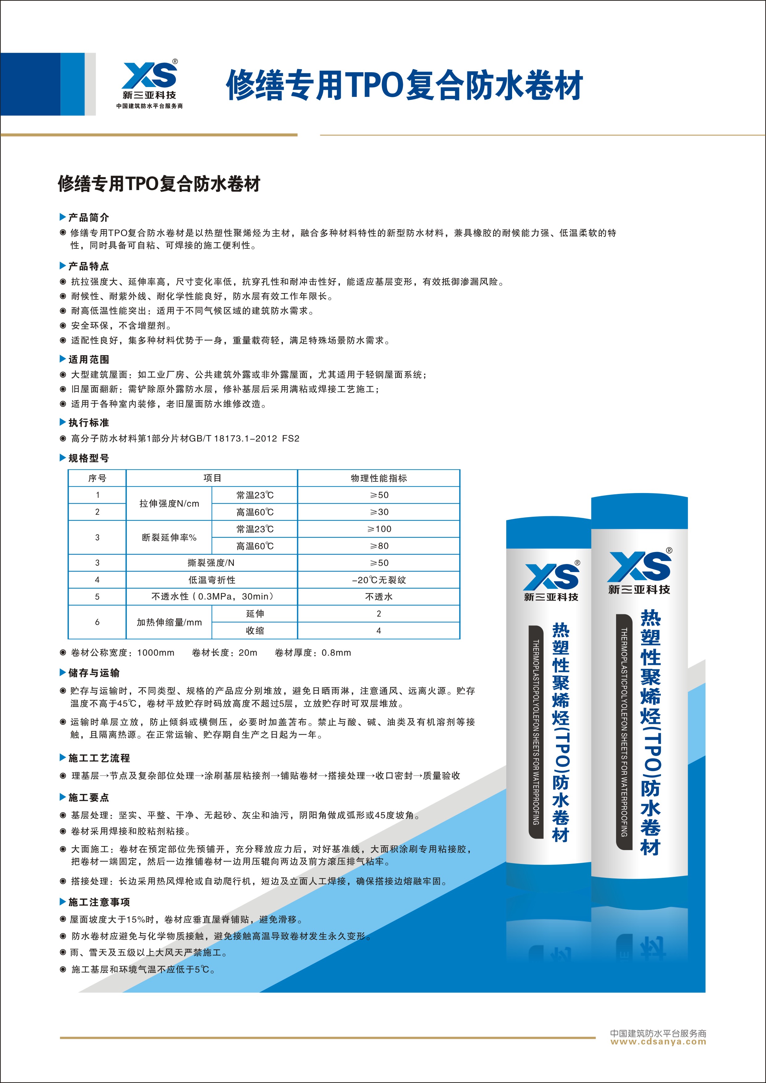 產(chǎn)品簡介: 修繕專用TPO復(fù)合防水卷材是以熱塑性聚烯烴為主材,融合多種材料特性的新型防水材料,兼具橡膠的耐候能力強、低溫柔軟的特性,同時具備可自粘、可焊接的施工便利性。 規(guī)格:FS2-TPO-20.0m×1.15m×0.8mm | ![]() |