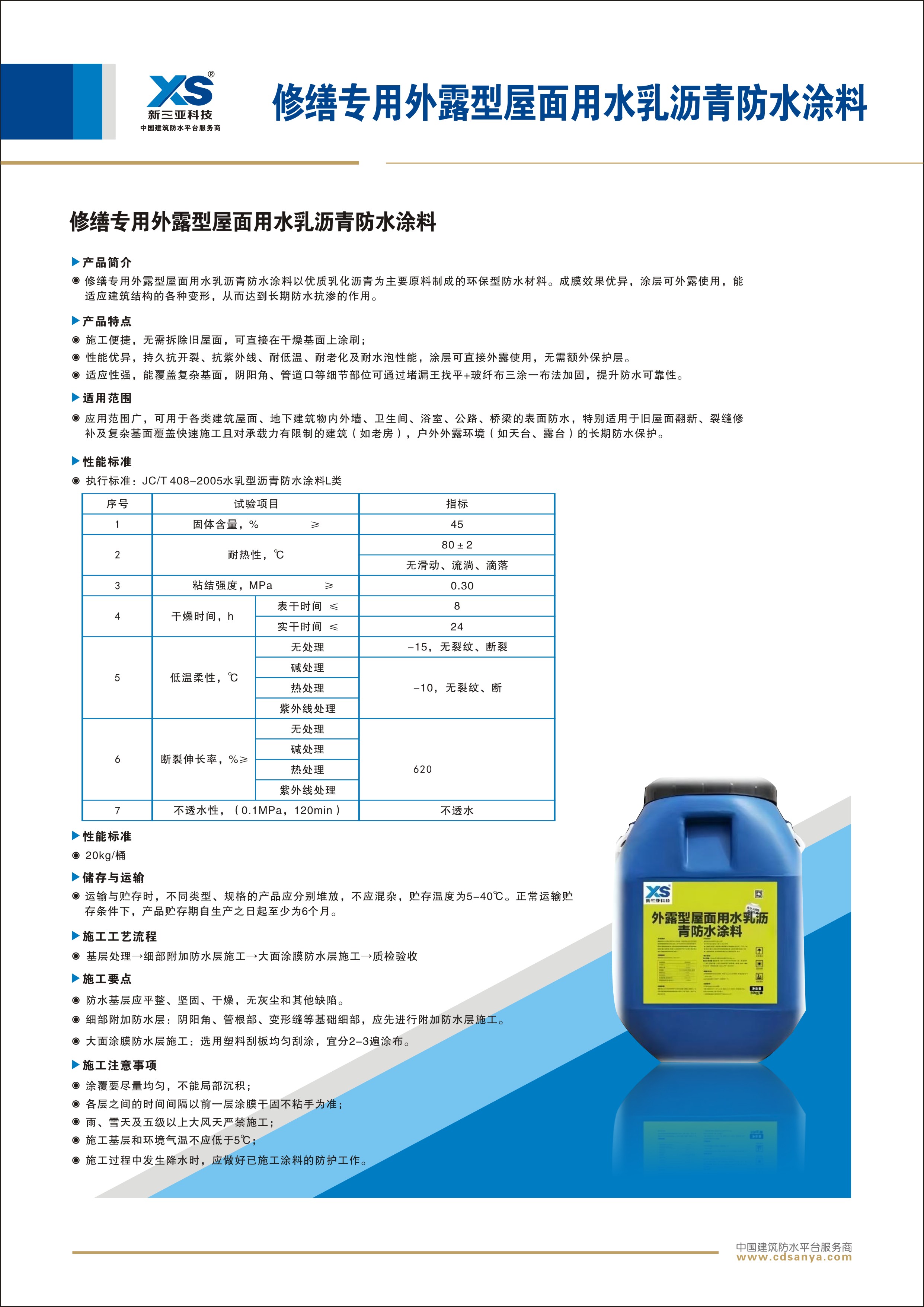 修繕專用外露屋面用水乳瀝青防水涂料是以優(yōu)質(zhì)乳化瀝青為主要原料制成的環(huán)保型防水材料。成膜效果優(yōu)異,涂層可外露使用,能適應(yīng)建筑結(jié)構(gòu)的各種變形,從而達(dá)到長(zhǎng)期防水抗?jié)B的作用。